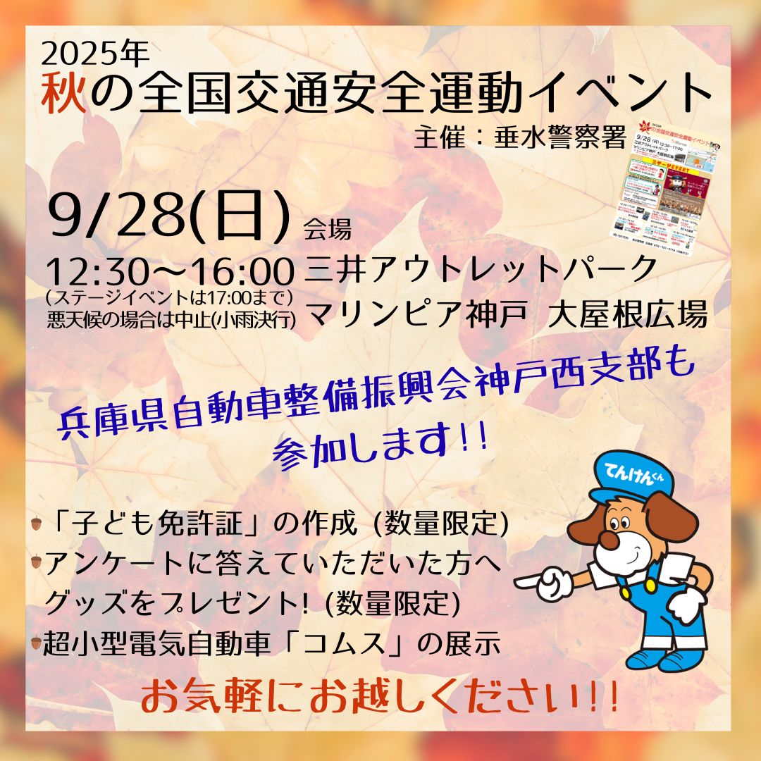 2025年9月28日(日)に神戸市垂水区の三井アウトレットパーク・マリンピア神戸 大屋根広場にて開催された「2025年 秋の全国交通安全運動イベント」(主催:垂水警察署)に初出展しました。